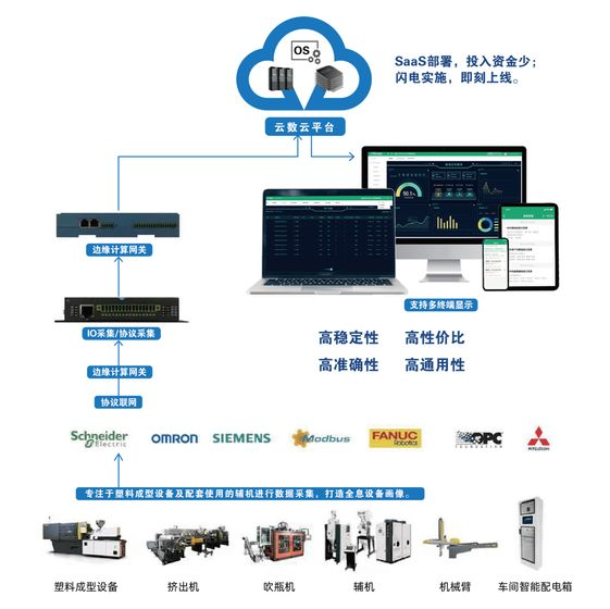 云數IoT系統(tǒng),是一套基于spring-cloud微服務架構的IoT物聯(lián)平臺,可與全球95%以上的注塑機實現聯(lián)網通訊。利用信息傳感器、射頻識別技術、紅外感應器、激光掃描器等裝置與技術,實時采集任何需要監(jiān)控、連接、互動的物體或過程,通過各類可能的網絡接入,實現物與物、物與人的泛在連接,以及對物品和過程的智能化感知、識別和管理。